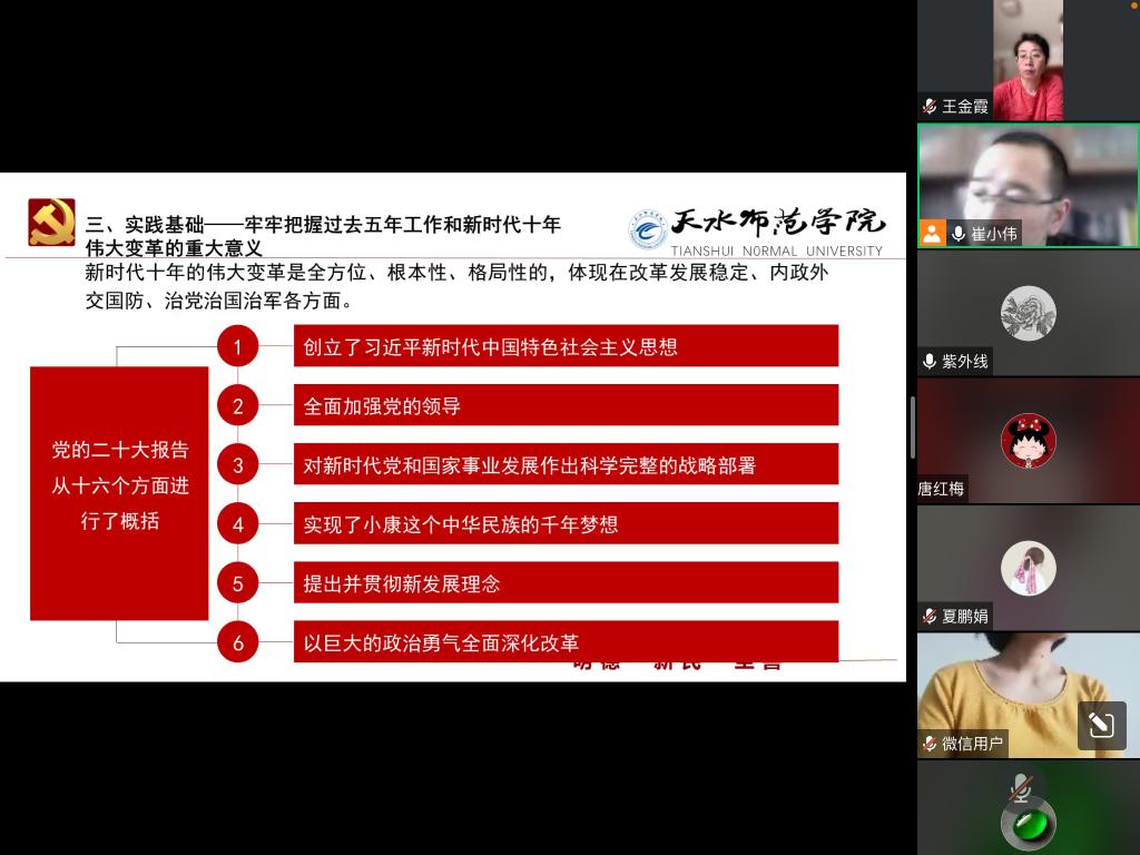 为进一步深入学习贯彻党的二十大精神,引导图书馆教职工把思想统一到党的二十大精神上来,把力量凝聚到图书馆发展的各项目标任务上来,12月2日上午,图书馆直属党支部举办学习贯彻党的二十大精神宣讲会,邀请学校宣讲团成员、马克思主义学院崔小伟博士作宣讲报告。宣讲会由图书馆直属党支部书记王金霞主持,图书馆全体教职工线上参加报告会。