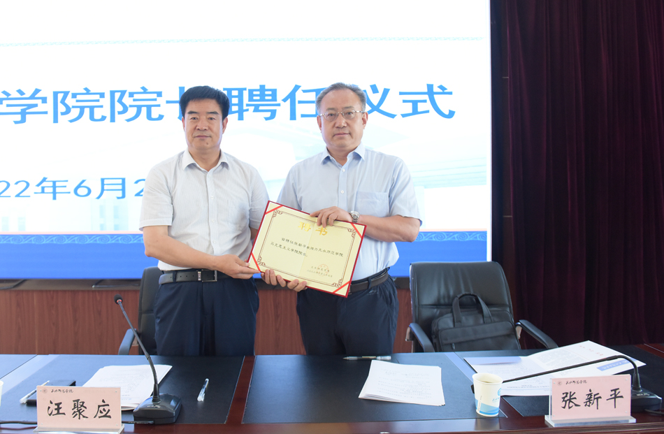 汪聚应宣读张新平教授聘任文件,为其颁发“马克思主义学院院长”聘书。汪聚应指出,张新平教授作为教育部政治学类教学指导委员会委员、教育部思想政治理论课教学指导委员会委员、甘肃省高校思想政治理论课教学指导委员会副主任委员被成功引进到我校工作,是天水师范学院与兰州大学加强和落实校际战略合作的重要体现,也是我校继成功引进兰州大学马建泰教授后又一次在引进高层次人才方面的新突破,汪聚应欢迎张新平教授加入天水师范学院,希望为我校马克思主义学院的建设提供指导和帮助,为天水师范学院高质量发展贡献力量。