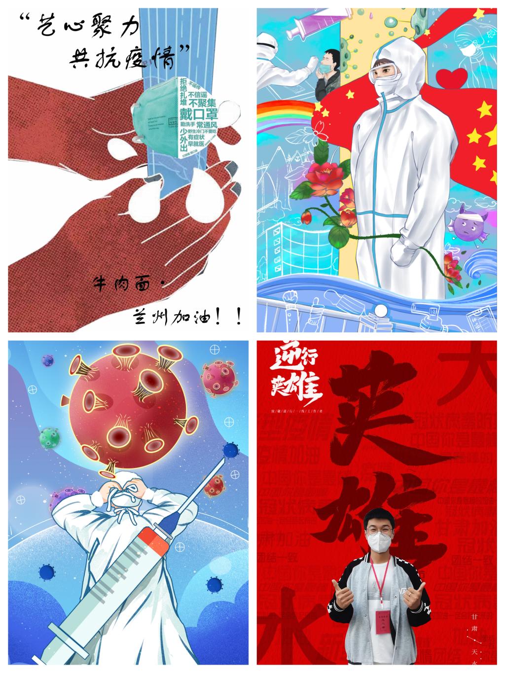 19级美术一班张晨晖创作了《牛肉面,呱呱,臊子面共同加油》。他说,有人在寒冷的冬日里把整箱的口罩送到警察局门口转身离开,有人在一线不眠不休抗击疫情,有人献出了自己的力量和爱心,他们都是英雄。20级绘画二班袁源源用画作致敬“最美逆行者”,坚信“人心齐,泰山移”,我们必将打赢疫情防控阻击战。19级视觉传达一班贠冰洁用画作《照顾好自己》表达科学理性应对疫情、做好自我防护、助力学校疫情防控的学子心声。19级美术二班晏家瑾创作的《师院加油》用画笔为师院加油,表达了对抗疫必胜的信心。19级美术一班刘清军创作了《深夜工作者》,他说,外国人感慨中国人总是被他们之中最勇敢的人保护得很好,哪有什么岁月静好,只不过是有人替你负重前行。我们一定要懂得感恩,且行且珍惜,做最勇敢的自我。