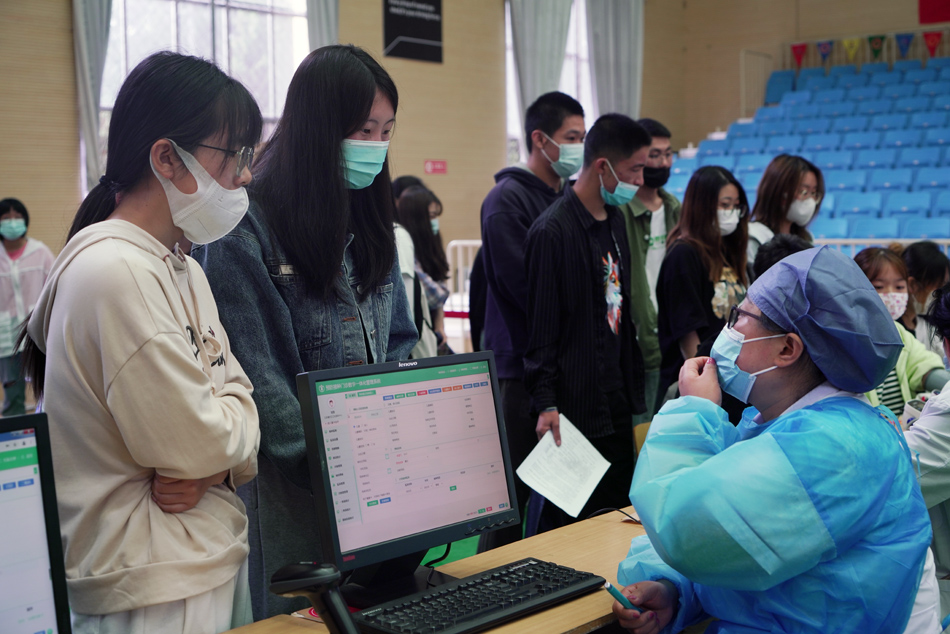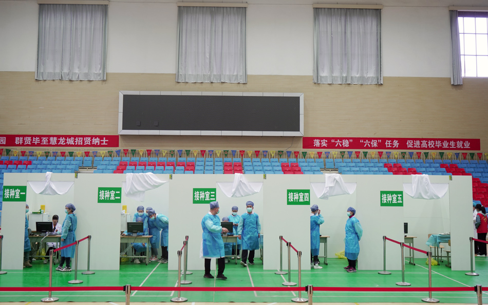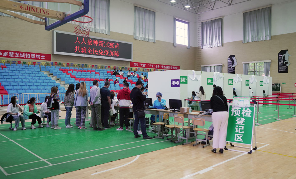 学校疫苗接种点设置在体育馆。接种现场,设置预检登记区、等候区、接种区、留观区、医疗救治区,在接种区域设置5个接种室,师生携带身份证、扫码测温,排队有序进入现场。各个分区都设有志愿者,主动为师生提供帮助。