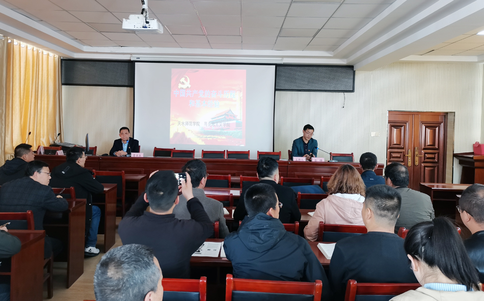马克思主义学院贾来生教授为两个支部的教师党员作了《中国共产党的奋斗历程和基本经验》的党史学习教育专题党课。此次党课以“线上+线下”相结合的“云上党课”形式进行,恭门中学1700多名学生和天水师范学院100多名学生党员同时通过手机或电脑在线收看学习。