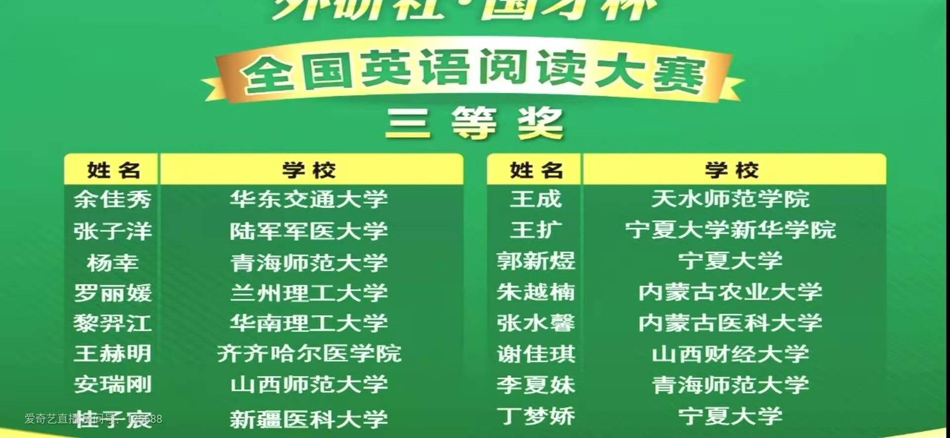 12月20日,2020“外研社·国才杯”全国英语写作、阅读大赛颁奖仪式在北京举行,我校外国语学院英语专业17级一班王成荣获全国阅读大赛总决赛三等奖。