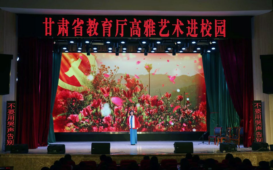 此次甘肃演艺集团敦煌艺术团专场演出为我们带来了《智取威虎山》《穆桂英挂帅.捧印》《拾玉镯》《闹天宫》等经典京剧折子戏。唱念做打舞、手眼身法步,演员们细腻的唱腔,独特的造型、精湛的演技,让师生陶醉于国粹京剧的独特魅力之中。演出过程中,国家一级演员、敦煌艺术团艺委会主任孟庆波老师向在场师生进行京剧知识普及,他说:“京剧是四大国粹之一,是积淀了民族审美习惯和文化传统的艺术瑰宝,中国人含蓄、稳健、精致、典雅的精神品格在京剧艺术里有着最丰富、最集中、最生动的体现,京剧在文学、表演、音乐、舞台美术等各个方面都有一套规范化的艺术表现形式。本场带来的《江姐》《智取威虎山》等选段,有力地表现了中国共产党党员把个人理想融入民族大义的家国情怀,希望同学们在感受“国粹”的同时,体会中国共产党人为中华民族谋复兴,为中国人民谋幸福的初心和使命!”