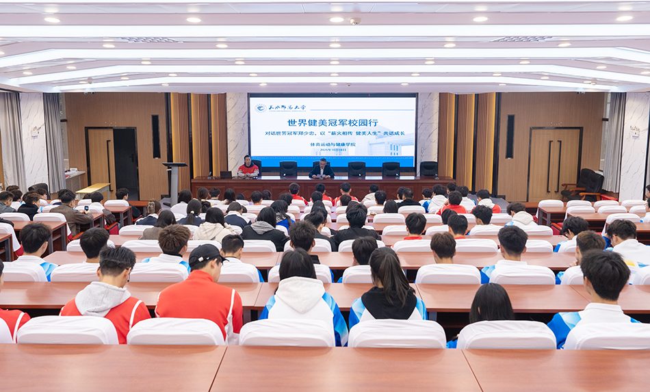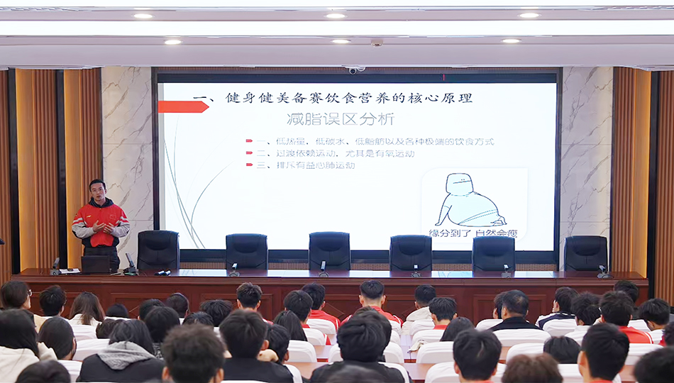 首场活动在学校报告厅举办,郑少忠作题为《健美备赛与健身健美专业发展就业指导》的专题报告。他结合自身多年征战赛场的经历,将健美备赛技术倾囊相授——从备赛周期的科学规划、不同阶段的饮食营养精准搭配,到训练强度的动态调控与心理状态的稳定调节,每一个环节都讲解得细致入微。同时,他还结合当前健身行业发展趋势,为相关专业学生梳理职业发展路径,提供清晰的就业方向指引与规划建议。