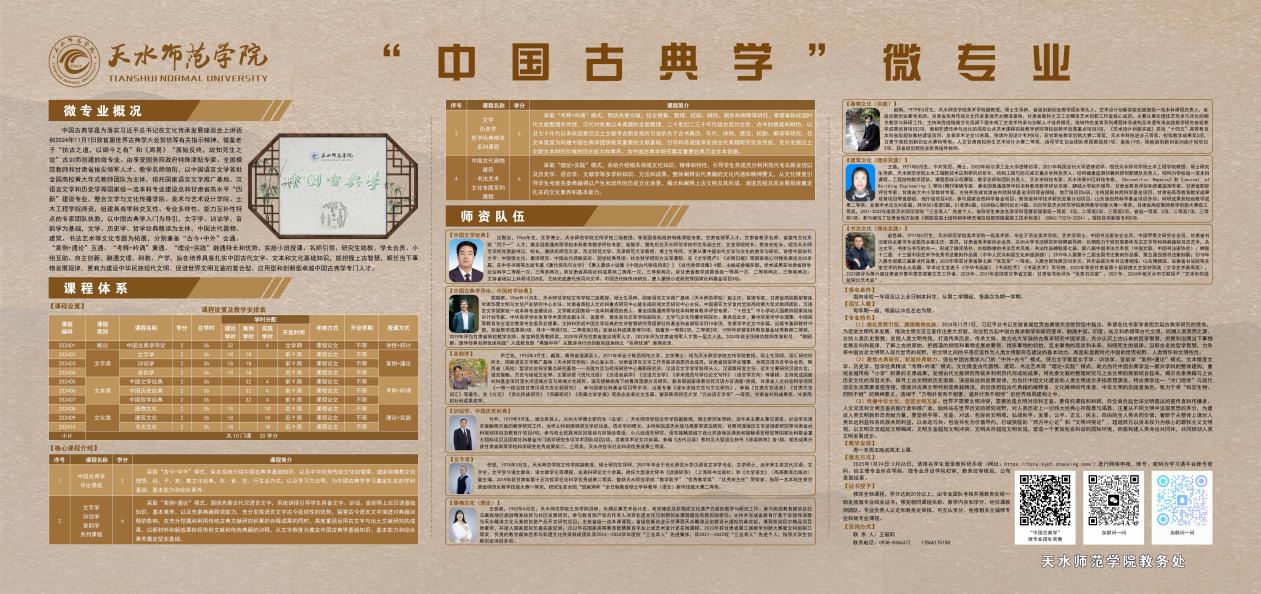 制定《天水师范大学学科专业改革实施方案》,紧密对接区域经济社会发展需求,建立健全专业动态调整机制,内涵建设质量稳步提升。新增药学、医学检验技术本科专业2个,撤销汉语国际教育专业。申请新增新能源汽车工程、数字经济等急需专业6个。汉语言文学等6个专业通过教育部师范类专业二级认证,思想政治教育等6个专业接受认证专家进校考查。组织开展一流本科专业建设点巡礼,创设中国古典学、文物保护创新与实践、现代农业生物技术、婴幼儿发展与健康管理等11个微专业和辅修专业。扩大“优师计划”“小学全科型教师计划”招生人数至209人。恢复科学教育专业招生,年均招生45人。师范类专业招生占比提升至41.27%,“优师计划”超一本线约25分,生源质量持续优化。
